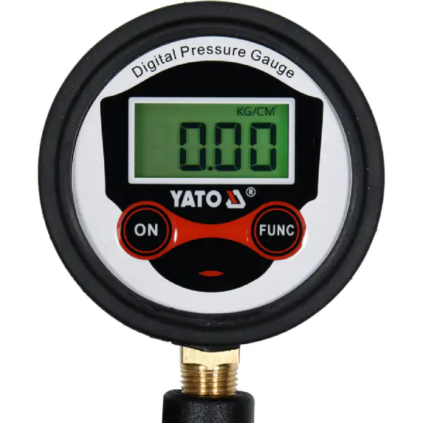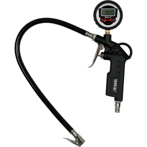 • YATO digitalni pištolj za duvanje guma sa LCD manometrom predstavlja napredno i precizno rešenje za profesionalno podešavanje pritiska u gumama u auto-servisima, na benzinskim pumpama i tokom ličnog održavanja vozila. Izrađen od laganog i izdržljivog aluminijuma sa težinom od svega 0,27 kg, ovaj pištolj je dizajniran za udoban i dugotrajan rad bez zamora ruke. Njegov ključni element je digitalni LCD manometar sa intuitivnim kontrolnim panelom, koji omogućava tačno i jasno očitavanje pritiska u realnom vremenu, eliminišući greške u tumačenju analognih skala. Crevo dužine 440 mm obezbeđuje dovoljnu fleksibilnost za pristup teško dostupnim ventilima, dok maksimalni radni pritisak od 0,8 MPa (8 bara) pokriva potrebe svih putničkih, teretnih i motociklističkih guma. Standardni pneumatski priključak omogućava lako povezivanje sa bilo kojim kompresorom, a uz upotrebu odgovarajućeg adaptera (koji se prodaje odvojeno), alat može da posluži i za pumpanje pontona, sportskih rekvizita, dušeka i drugih inflatibilnih predmeta. Kombinujući preciznost digitalne tehnologije, ergonomski dizajn i pouzdanost, ovaj pištolj je neophodan alat za svakog profesionalca ili entuzijastu kojem je konstantan i tačan pritisak u gumama od suštinskog značaja za bezbednost, ekonomičnost i performance vozila.
