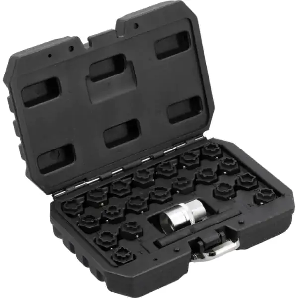 • Uvereni u efikasnost i izdržljivost, YATO set od 22 čaure za sigurnosne matice predstavlja specijalizovano resenje za auto-servise i vulkanizerske radionice. Ovaj profesionalni set je dizajniran za brzo i pouzdano uklanjanje sigurnosnih matica na vecini Audi vozila proizvedenih izmedju 2002. i 2012. godine. Svaka caura je izradjena od visokokvalitetnog hrom-molibdenskog (CrMo) celika, sto garantuje izuzetnu cvrstinu i otpornost na udarna opterecenja i habanje. Zastitni oksidni premaz dodatno sprecava koroziju i produžava radni vek alata. Standardni prihvat od 1/2" (12.7 mm) obezbedjuje kompatibilnost sa profesionalnim udarnim alatima i rucnim kljucevima, omogucavajuci direktnu i mocnu primenu. Set pokriva sirok spektar velicina (A, B, C, E, F, G, H, I, J, L, M, N, P, Q, R, S, T, V, W, X), cime obezbedjuje spremnost za razlicite modele. Ovo je neophodan alat za svakog profesionalca koji trazi preciznost, brzinu i sigurnost u radu na tockovima.
