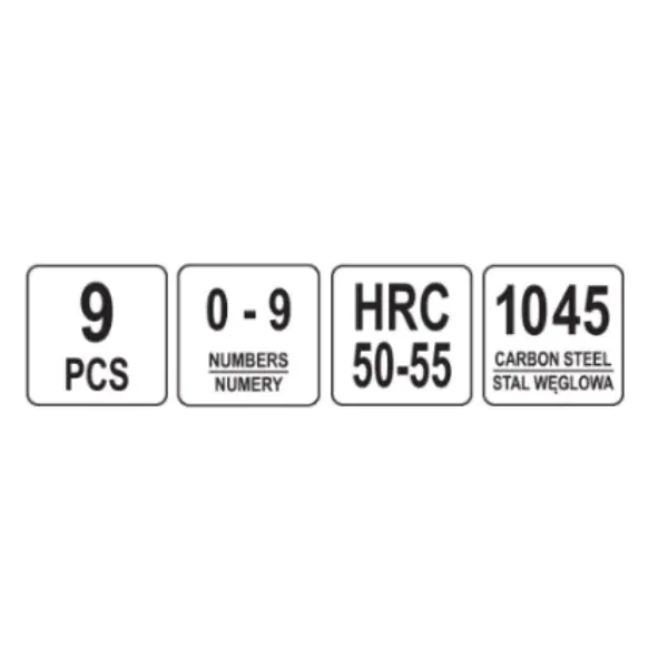 • Set je sakupljen u plastičnom kontejneru i sadrži sledeće brojeve: 0, 1, 2, 3, 4, 5, 6, 7, 8 mm.