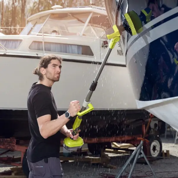 Opremljen je teleskopskim štapom dužine do 1,4 m, okruglom četkom od 15 cm i glavom od pene za poliranje, što ga čini pogodnim za različite zadatke – od garažnih vrata i zidova do automobila i čamaca. Brzina rotacije od 210 o/min efikasno uklanja prljavštinu uz minimalan napor. Kućište baterije sa zaštitom IPX7 omogućava rad sa vodom i sredstvima za čišćenje, pa je alat idealan za unutrašnje i spoljašnje površine.