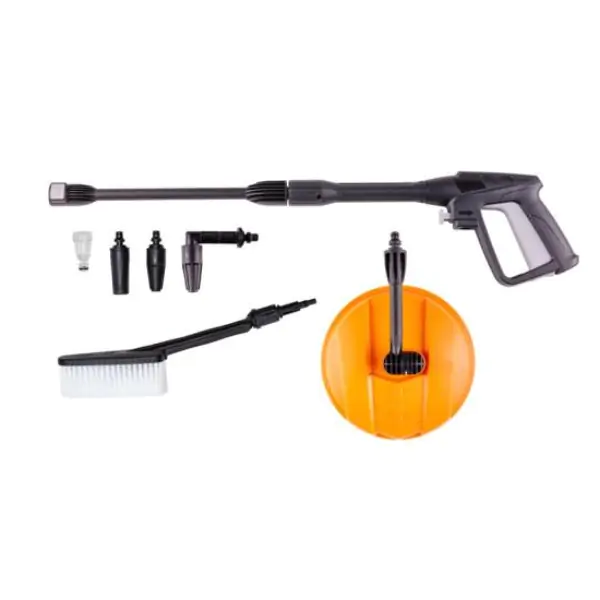 • Uz aparat dolazi i četka za pranje podova, idealna za čišćenje trotoara i staza, kao i ravna četka za različite površine. Pištolj za pranje ima brzi konektor za jednostavno povezivanje sa crevom. Aparat ima i posudu za deterdžent za dodatno čišćenje.