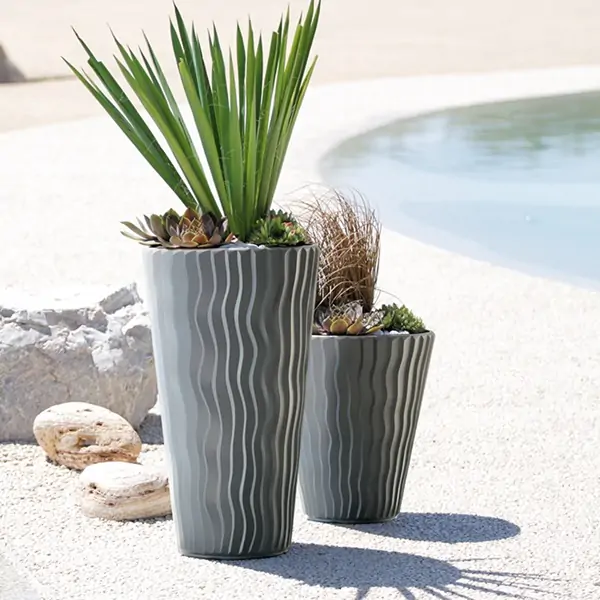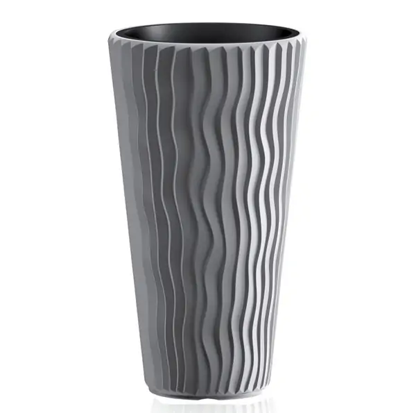 • Saksija izrađena od visokokvalitetne, otporne plastike.Njihova otmena površina sa talasastim vertikalnim ispupčenjima podseća na pustinjski pesak.