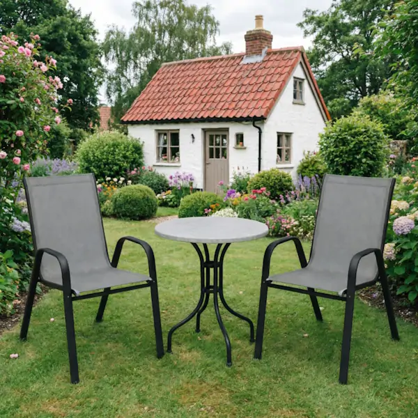• Konstrukcija stolice izrađena je od čeličnog rama sa praškastim premazom, koji obezbeđuje visoku otpornost na vlagu, koroziju i spoljašnje uticaje. Ovakva završna obrada omogućava dugotrajnu upotrebu čak i u zahtevnim vremenskim uslovima. Sedište i naslon od ojačane Textilene 2/1 tkanine pružaju maksimalnu udobnost i prozračnost, pa dodatni jastuci nisu potrebni. Materijal je elastičan, brzo se suši i jednostavan je za održavanje, što ovu stolicu za baštu otporna na vremenske uslove čini izuzetno praktičnom.