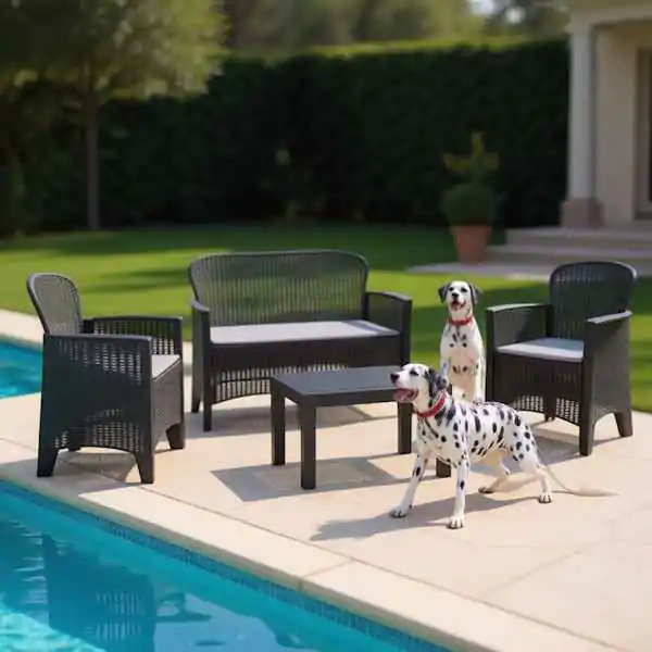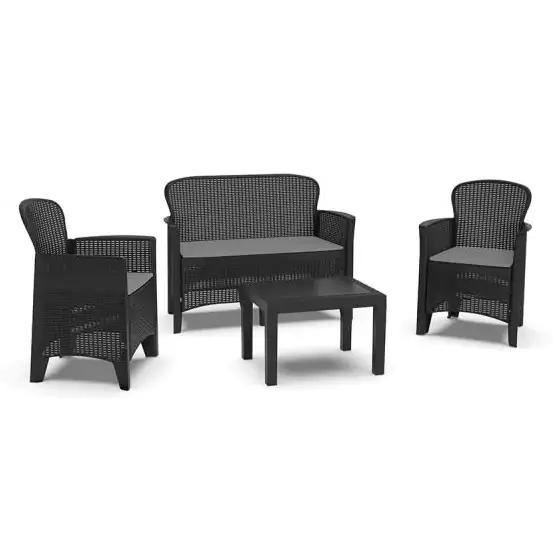 • Ovaj komplet sadrži dve fotelje, dvosed i sto, pružajući savršeno mesto za opuštanje i druženje na otvorenom.