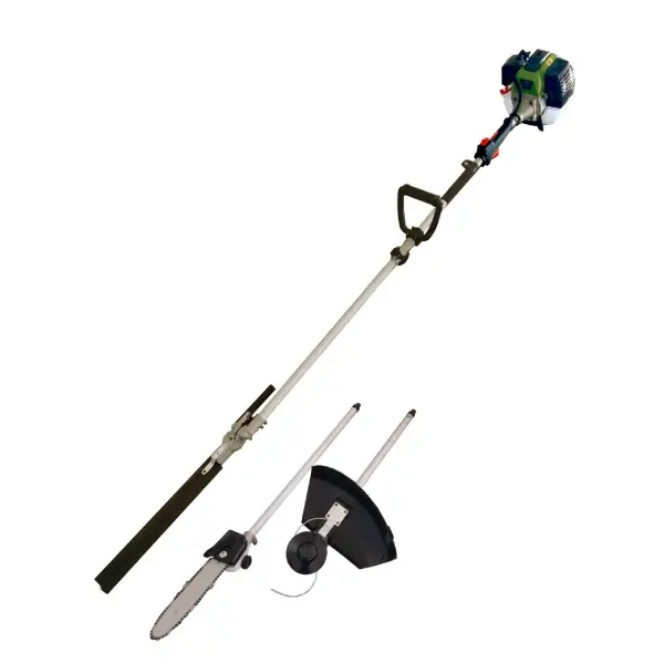 • Praktična mašina sa tri nastavka: trimerom za travu, trimerom za živu ogradu i testerom za visoke grane. Ima benzinski, 2-taktni motor od 2.95 KS.