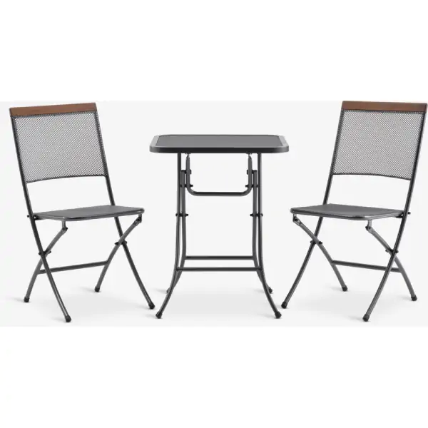 • Baštenska lounge garnitura u sivoj boji, koja se sastoji od jednog stola i dve stolice, donosi savršen spoj funkcionalnosti i estetike za opremanje vaše terase, balkona ili bašte. Stolice dimenzija 46 x 54 x 89 cm, sa visinom sedišta 46 cm, imaju čeličnu konstrukciju i naslone za ruke od masivnog drveta eukaliptusa, obrađenog uljem, što im daje prirodan i topao izgled. Kvadratni sto dimenzija 60 x 60 x 75 cm, sa čeličnom konstrukcijom i Durasint®-premazom, pruža stabilnu površinu za odlaganje. Komplet je sklopiv, što olakšava skladištenje, a nosivost mu je impresivnih 220 kg. Drvo eukaliptusa nosi FSC™ 100% sertifikat, garantujući odgovorno poreklo. Preporučuje se odlaganje u zatvorenom prostoru tokom zime i redovno tretiranje uljem za drvo.