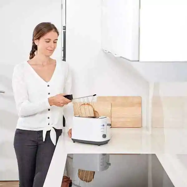 • Posuda za mrvice koja se lako uklanja pomaže da vaša kuhinja ostane uredna, dok poluga sa dodatnim podizanjem omogućava sigurno i lako uklanjanje pečenih kriški