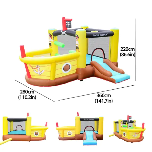 • Set uključuje električnu pumpu, torbu za nošenje, komplet za pričvršćivanje u zemlju i set za popravku, što omogućava jednostavno postavljanje, sigurnost i lako održavanje. Ključne reči: dečija igraonica na naduvavanje, gusarski brod igraonica, naduvava igraonica sa toboganom, skakaonica za decu, igraonica za dvorište.
