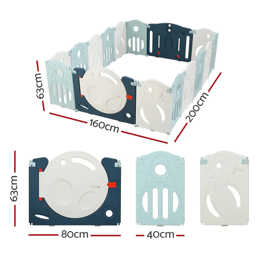 • Dečija ogradica “Raketa” u plavoj boji predstavlja savršen spoj sigurnosti, zabave i praktičnosti, stvarajući šaren i stimulativan prostor za bezbrižno igranje mališana. Sa dimenzijama 160 × 200 cm i visinom od 63 cm, pruža dovoljno prostora za kretanje, puzanje i prve korake, a istovremeno garantuje sigurnost deteta. Set se sastoji od 14 čvrstih panela, uključujući jedan panel za igru i jedan panel sa vratima za jednostavan ulazak i izlazak, dok atraktivna plava boja dodatno podstiče vizuelnu stimulaciju i doprinosi uređenju prostora.