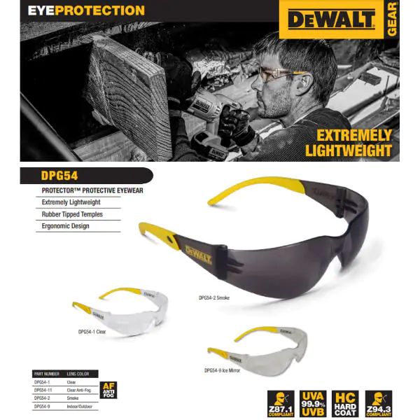 • DPG54 zadovoljava ANSI Z87.1 standard za otpornost na udarce i pruža 99.9% zaštitu od UV zraka.