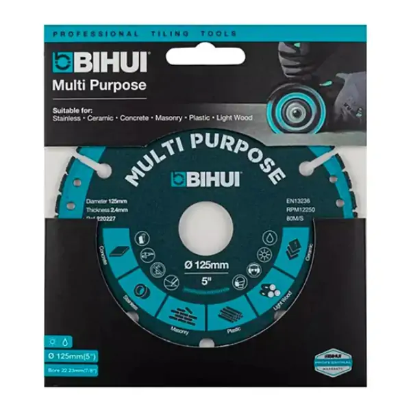 • Dijamantska multifunkcionalna rezna ploča BIHUI DSBS125 je vrhunski alat koji definiše univerzalnost i izdržljivost. Proizvedena naprednim postupkom vakuumskog lemljenja, ova ploča poseduje izuzetnu čvrstinu i otpornost na habanje, garantujući dug radni vek čak i pri kontinuiranom sečenju materijala različitih tvrdoća. Sa segmentnim dijamantskim obodom debljine 2,4 mm, pruža brzu, preciznu i čistu seču čelika, obojenih metala, porcelanskog kamena, mermera, cigle, plastike i drveta. Kompatibilna je sa standardnim M14 prihvatom i može se koristiti za suvo i mokro sečenje, nudeći maksimalnu fleksibilnost u različitim radnim uslovima. Sa maksimalnom dozvoljenom brzinom od 12.250 obrtaja u minuti, BIHUI DSBS125 je pouzdan partner za sve vaše zahvate, bilo da radite na gradilištu ili u radionici.