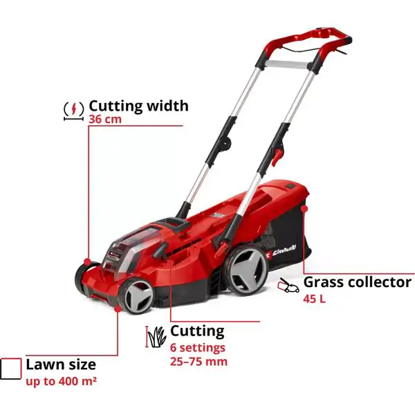 • Einhell akumulatorska kosačica RASARRO 36/36 omogućava jednostavno, tiho i efikasno održavanje travnjaka bez upotrebe kablova. Napajanje obezbeđuju dve 18 V Power X-Change litijum-jonske baterije koje zajedno daju radni napon od 36 V, čime se postiže optimalan odnos snage i autonomije rada. Uređaj se preporučuje za travnjake površine do 400 m², što ga čini pogodnim izborom za dvorišta porodičnih kuća i manje zelene površine.