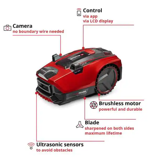 • Einhell FREELEXO CAM PLUS 600 je napredna robotska kosačica nove generacije, idealna za precizno i autonomno održavanje travnjaka do 600 m² bez potrebe za postavljanjem granične žice. Zahvaljujući integrisanoj kameri i ultrazvučnim senzorima, ovaj model automatski prepoznaje ivice travnjaka, prepreke i različite površine poput ivičnjaka, drveta ili malča. Detekcija se zasniva na boji i strukturi tla, a dodatna mogućnost definisanja zona pomoću magnetne trake omogućava privremeno ograničavanje područja košenja.