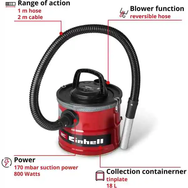 • Einhell TC-AV 1830 D je snažan električni usisivač za pepeo namenjen bezbednom i efikasnom uklanjanju ohlađenog pepela iz kamina, peći na pelet, peći na čvrsto gorivo i roštilja. Sa snagom od 800 W i usisnom silom od 170 mbar, ovaj uređaj omogućava temeljno čišćenje finog pepela i sitne prašine bez rasipanja po prostoru.