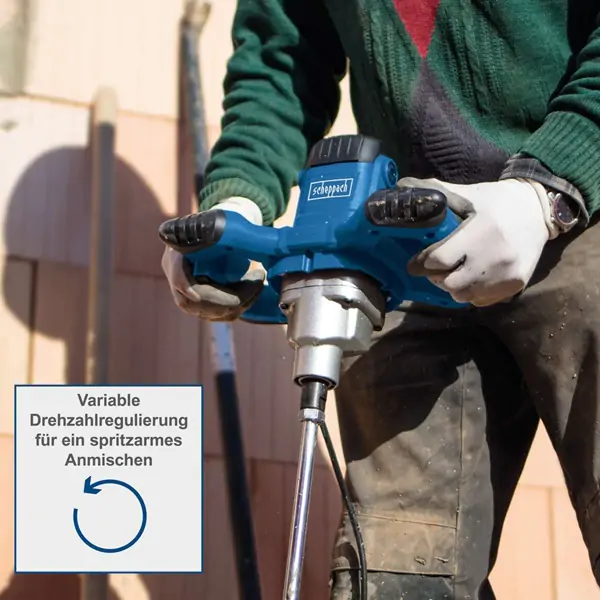 • Scheppach PM1200 je dragoceni pomoćnik za profesionalno mešanje tečnih i praškastih materijala, kao što su boje, malter i beton. Snažan motor od 1200 W pruža dovoljno snage čak i za guste građevinske materijale.