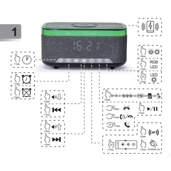 • Unesite praktičnost, stil i funkcionalnost u vašu spavaću sobu uz Gembird digitalni budilnik. Kombinujući alarm, bežični zvučnik, FM radio, bežični punjač i RGB noćno svetlo, ovaj uređaj zadovoljava sve vaše potrebe za udobno i moderno okruženje.