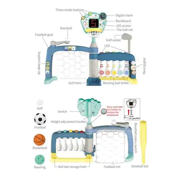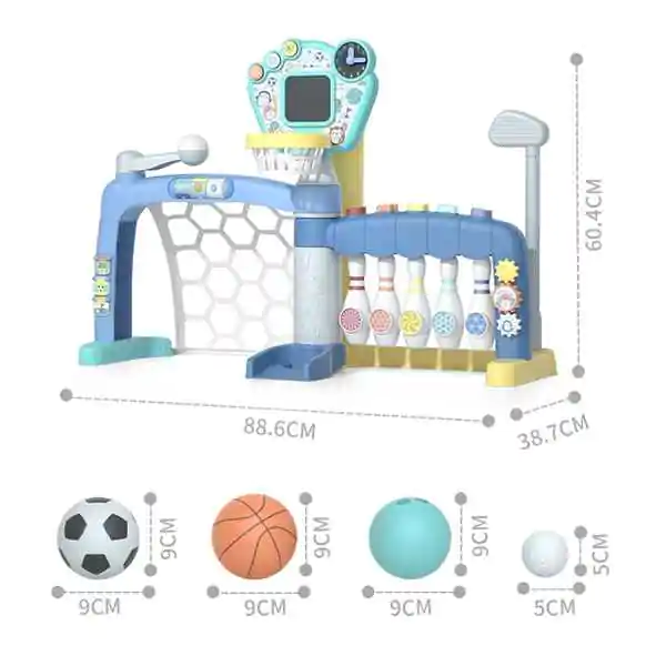 • Napajanje na baterije i ugrađeni zvučni efekti dodatno podižu nivo zabave, stvarajući interaktivnu atmosferu koja podstiče decu da se više kreću i duže zadrže pažnju. Bilo da šutiraju gol, ubacuju koš, pogađaju metu u bejzbolu, uče prve pokrete golfa ili obaraju čunjeve u kuglanju, mali sportisti istovremeno razvijaju koordinaciju, ravnotežu, preciznost i reflekse. Ova igračka pruža idealan balans između fizičke aktivnosti i zabavnih izazova, podstičući zdrave navike kroz igru.