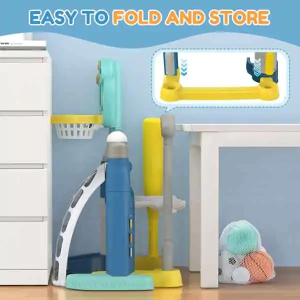 • Set je izrađen od kvalitetne plastike i ojačan metalnim elementima, što garantuje stabilnost i dugotrajnost tokom upotrebe. Dimenzije proizvoda 88.6 × 38.7 × 60.4 cm čine ga pogodnim za igru u kući, dečijoj sobi ili dvorištu. Zahvaljujući kompaktnom i praktičnom dizajnu, lako se postavlja i koristi, a deca mogu da ga koriste samostalno ili u igri sa prijateljima i porodicom, podstičući timski duh i zdravu kompetitivnost.
