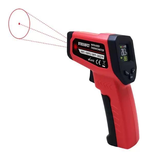 Infracrveni termometar 550°C DT8550FCTDaljinski infracveni termometar sa osvetljenim LCD displejemPoseduje laser u obliku kruga za precizno određi ...