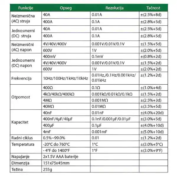 •     40 A (rezolucija 0,01 A, tačnost ±(2,5%+8d))