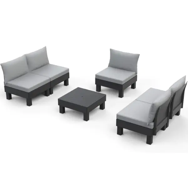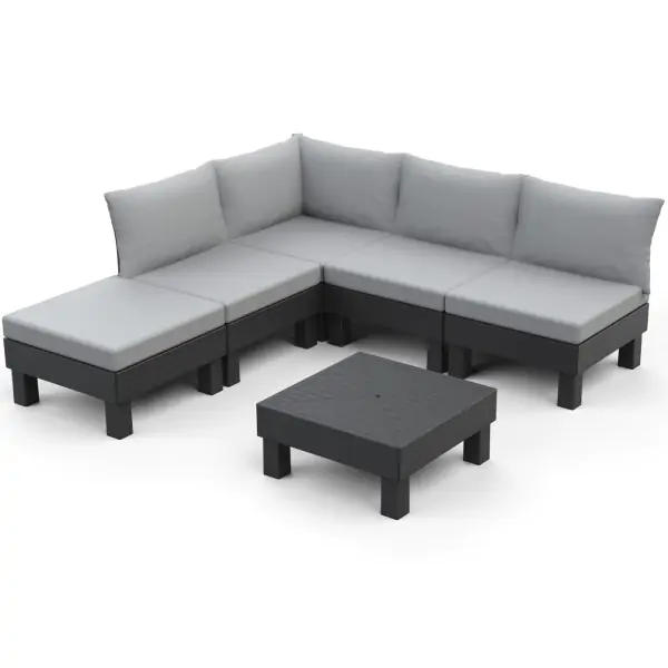 • Sastoji se od pet udobnih sedišta i pratećih jastuka za leđa, pružajući udobnost i podršku tokom opuštanja na otvorenom