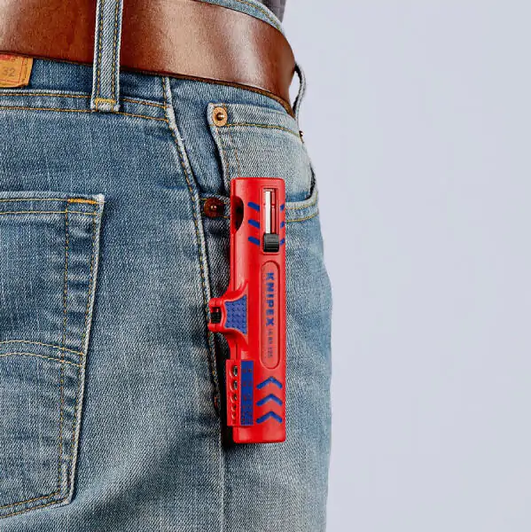 • 16 85 125 SB Univerzalni alat za skidanje omotača Prikladan za skidanje omotača i izolacije svih uobičajenih okruglih i kabla za vlažne prostore od Ø 8,0 do 13,0 mm (npr.: NYM kabl 3 x 1,5 mm² do 5 x 2,5 mm²). takođe zakoristi se za razdvajanje i pregrađivanje uglova. Dvodelni, otklopivi alat za skidanje izolacije. Sa oprugom za otvaranje i mehanizmom brave. Pričvrsna kopča za sigurno čuvanje. sa dodatnim nožem za uzdužne rezove. unutrašnji, teleskopski nož. alat za skidanje izolacije za preseke 0,2 / 0,3 / 0,8 / 1,5 / 2,5 / 4,0 mm². sa integriranom vodilicom za kabl za uzdužni rez. sa fiksne izolacije (npr. bez halogena) može se tako lakše skinuti plašt. - Vrednosti skidanja izolacije za pojedine žile: 0,2mm² / 0,3mm² / 0,8mm² / 1,5mm² / 2,5mm² / 4,0mm² - Vrednosti skidanja izolacije, kvadratni milimetri: 0,2 — 4mm² - Vrednosti skidanja izolacije (prečnik): Ø 8 – 13mm - tip kabla: okrugli kabl, npr.: 3 x 1,5 mm² do 5 x 2,5 mm²