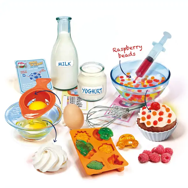 • Sadrži: epruvete, stalak za epruvete, plastični špric, pipete, čašu za merenje, kalup za mafine, mutilicu, separator za jaja, cediljku, kesice sa sastojcima za hranu, uputstvo sa receptima