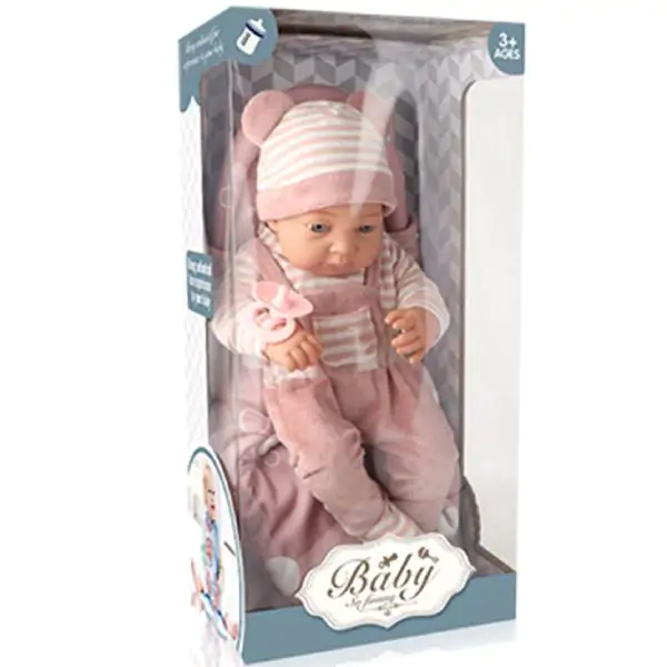 • Lutka beba od gume 38cm u odelcetu nezno roze boje sa cuclom u mekanoj nosiljci 40cm koju dete može nositi u rukama,položiti u krevetac i slično