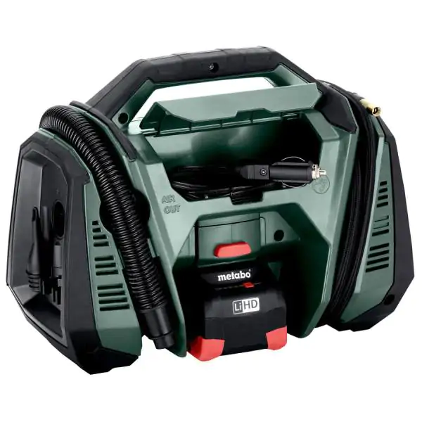 • Metabo AK 18 MULTI može se koristiti sa 18 V LiPOWER ili LiHD baterijama, što pruža fleksibilnost i prenosivost, ili alternativno preko 12V kablova za automobil, što je posebno korisno za upotrebu na terenu ili tokom putovanja. Sa dimenzijama od 328 x 185 x 256 mm, kompresor je dovoljno kompaktan za jednostavno skladištenje i transport. Težina kompresora je 2,6 kg bez baterije i 3,6 kg sa baterijom, što ga čini lakim za rukovanje i upotrebu.
