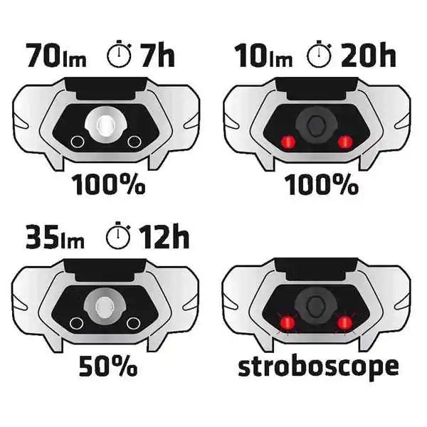 • Lampa je opremljena sa tri LED diode – jednom belom i dve crvene, koje omogućavaju različite režime osvetljenja u skladu sa potrebama korisnika. Dostupne su četiri funkcije svetla: