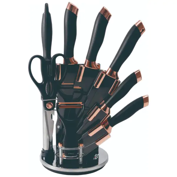 • OV51633K9G kompletan set kuhinjskih noževa na elegantnom stalku predstavlja savršen spoj funkcionalnosti i estetike, idealan za sve ljubitelje kuvanja koji cene kvalitet i organizaciju u kuhinji. Set sadrži 6 visokokvalitetnih noževa različitih namena, uključujući nož za seckanje (6,5"), kuvarski nož (8"), nož za sečenje (8"), uslužni nož (5") i nož za raščlanjivanje (3,5"). Uz noževe dolaze i praktični dodaci: oštrač za održavanje oštrice, ljuštilica za povrće i voće, kao i kvalitetne kuhinjske makaze. Sav pribor je smešten na akrilni blok sa rotirajućom bazom, koji omogućava jednostavan pristup i preglednost, uz elegantan crni dizajn sa ružičastim zlatnim (rose gold) detaljima. Set je idealan za svakodnevnu upotrebu, a predstavlja i savršen poklon za sve koji uživaju u kuvanju.
