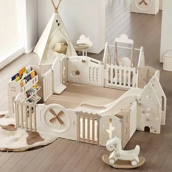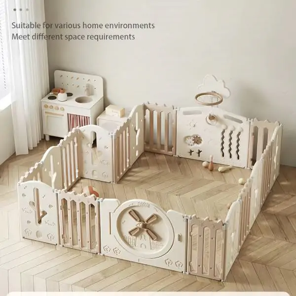 • Ogradica uključuje tobogan sa nosivošću do 40 kg, ljuljašku sa nosivošću do 25 kg, konjića za ljuljanje sa nosivošću do 40 kg, koš za bacanje lopte koji podstiče sportski duh, kabinet za odlaganje igračaka i knjiga, kao i tablu za crtanje koja omogućava umetničke i kreativne aktivnosti. Svi elementi su pažljivo dizajnirani da razvijaju dečiju radoznalost, stvaralaštvo, osećaj ravnoteže i socijalne veštine kroz igru. Izrađena od kvalitetnog HDPE materijala koji je siguran i dugotrajan, ogradica garantuje bezbednost i zdravlje mališana, dok pametan dizajn omogućava jednostavno sklapanje, održavanje i čuvanje.