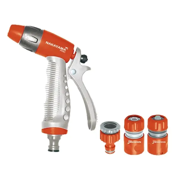 NAKAYAMA pištolj prskalica set 4/1 (GH9214) je praktičan i kompletan alat za zalivanje bašte, travnjaka, dvorišta i drugih zelenih površina. Set uključuje pištolj prskalicu, konektor za crevo, konektor sa zaustavljačem i adapter za crevo, što omogućava jednostavno povezivanje i kontrolu protoka vode. Izrađen je od izdržljive plastike, što garantuje dugotrajnost i lakše rukovanje.