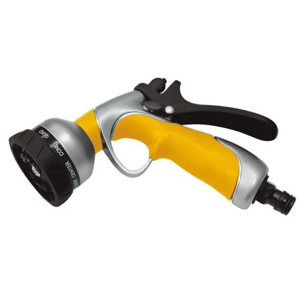 Prskalica ima potpuno podesiv protok, dok su mlaznica i drška prekrivene neklizajućim slojem za sigurnu i udobnu upotrebu. Zaključavanje okidača omogućava kontinuirano prskanje bez stalnog pritiska, dok izdržljivo i lagano aluminijumsko kućište garantuje dug vek trajanja i otpornost na habanje.