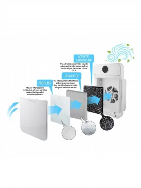 • 3 filtera: Predfilter + visoko efikasni hepa filter, filter sa aktivnim ugljem.