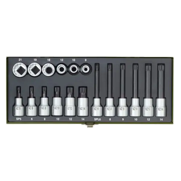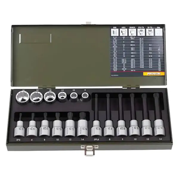 • Proxxon set nasadnih ključeva sa 12-ugaonim profilom idealan je za rad na motornim vozilima, uključujući cilindre, pogonske osovine i zadnje osovine. Set od 18 delova dolazi u izdržljivom čeličnom koferu, koji je premazan prahom za dugotrajnost, pružajući odličnu zaštitu alata. Sadrži nasadne ključeve za prijem 1/2" kvadratnog prihvata i odvijačke nastavke različitih dimenzija, kako u standardnoj, tako i u produženoj varijanti. Svi delovi su izrađeni od visokokvalitetnog hrom-vanadijum čelika (31 CrV 3) koji premašuje standarde DIN/ISO za tvrdoću i maksimalni obrtni moment.