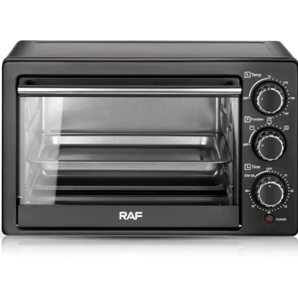 • Raf mini pećnica model R.5321 zapremine 22 litra i snage 1200 W predstavlja svestrano i praktično rešenje za svakodnevnu pripremu obroka, kombinujući dovoljno prostora sa snažnim performansama u elegantnom crnom dizajnu. Opremljena je kontrolom temperature u rasponu od 80 do 230 °C i tajmerom do 60 minuta, što omogućava precizno podešavanje i ravnomerno pečenje peciva, mesa, povrća ili brzo zagrevanje hrane. Kompaktnih dimenzija 43 x 33 x 31 cm i kabla dužine 0,95 m, ova pećnica se lako uklapa u svaki kuhinjski prostor, a uz kompletni pribor koji uključuje pleh za pečenje, rešetku za pečenje i pleh za roštilj, pruža širok spektar mogućnosti za kreativno kuvanje. Ova mini pećnica je idealan izbor za sve koji traže spoj funkcionalnosti, kontrole i modernog dizajna u svakodnevnoj upotrebi.