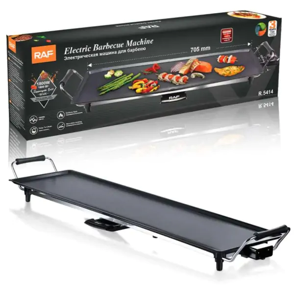 • Raf električna gril ploča model R.5414 sa impresivnim dimenzijama ploče od 70,5 x 23,5 cm i snagom od 1800 W predstavlja idealno rešenje za pripremu raznovrsnih jela na zdrav i praktičan način, pružajući dovoljno prostora za istovremeno pečenje mesa, povrća, ribe ili sendviča. Aluminijumska ploča obezbeđuje ravnomernu raspodelu toplote i brzo zagrevanje, dok dodatna posuda za skupljanje ulja omogućava odvajanje viška masnoće tokom pripreme, doprinoseći zdravijoj ishrani. Kompaktan, ali izuzetno funkcionalan dizajn čini ovu gril ploču pogodnom za svaku kuhinju, uz kabl dužine 90 cm koji omogućava fleksibilno postavljanje na radnoj površini i stabilan rad na standardnom naponu od 220–240 V uz frekvenciju 50/60 Hz. Raf R.5414 električna gril ploča je idealan izbor za porodične obroke i druženja, kombinujući veliku površinu za pečenje sa jednostavnom upotrebom i lakoćom održavanja.