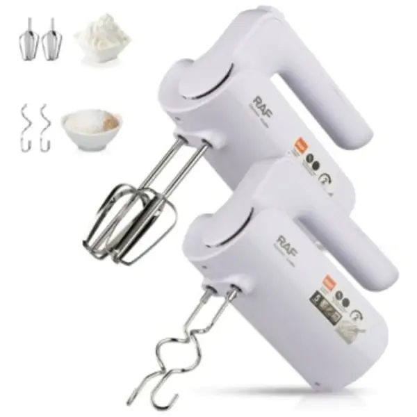 • Raf mikser model R.6653W snage 800 W predstavlja idealnog pomoćnika u svakoj kuhinji, sa moćnim motorom i elegantnim dizajnom koji omogućava lako pripremanje različitih recepata od laganih kremova do gustog testa. Opremljen je sa 5 nivoa brzine koji pružaju potpunu kontrolu tokom rada, omogućavajući vam da odaberete idealnu brzinu za mućenje jaja, pripremu šlaga ili mešenje testa uz ujednačeno mešanje bez grudvica. Uz mikser dolaze dve metlice za mućenje jaja i dve metlice za testo, čineći ga svestranim uređajem za različite kulinarske zadatke, dok dužina kabla od 1 metra i rad na naponu od 220 V i frekvenciji 50–60 Hz čine ga jednostavnim za korišćenje i odlaganje. Lagan, kompaktan i praktičan, ovaj mikser će brzo postati vaš omiljeni kuhinjski saveznik.