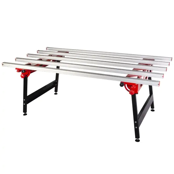• Sa dva pomična tragača i širokim profilima u obliku slova T, ovaj sto pruža površinu za podršku koja omogućava rad kao na radnom stolu za upotrebu manjih alata, kao što su ručni sekači.