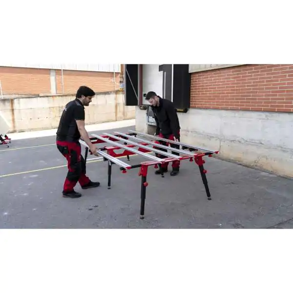 • Ovaj radni sto je osmišljen da pruži maksimalnu praktičnost i stabilnost. Zahvaljujući obliku nogu i strukturi, sto ostaje izuzetno stabilan i čvrst, čak i u svojoj najširoj poziciji. Podesive noge osiguravaju stabilnost čak i na neravnim podovima, dok preklopne noge i dva bočna točkača olakšavaju transport i skladištenje.