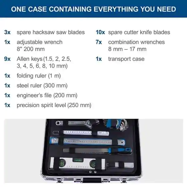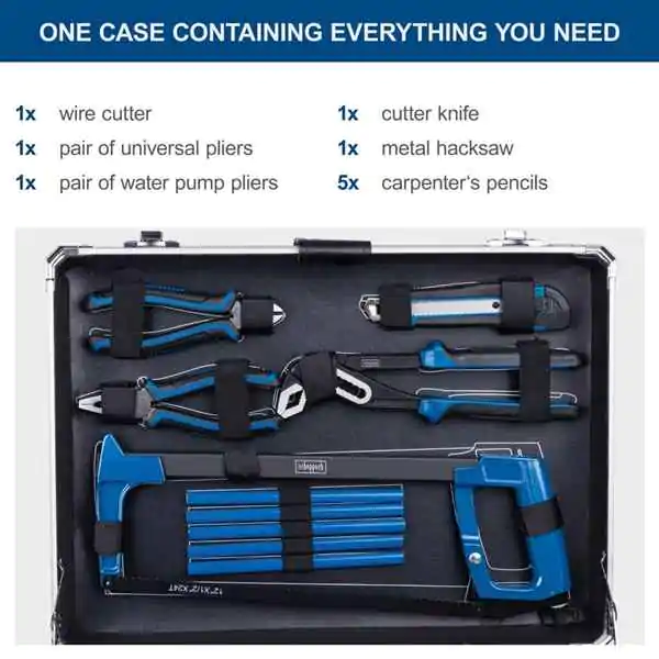 • 1x ispitivač / čekić / čelično ravnalo / radionička turpija / precizna libela / teleskopski magnetni dizač / klešta za vodenu pumpu / bočni rezači / kombinovana klešta / merna traka /