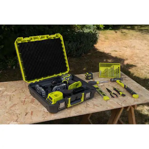 • RYOBI RDD18-2C20TAH je kompletan set alata za sve ljubitelje "uradi sam" projekata i početnike u zanatskim radovima. Ovaj set uključuje RYOBI 18V ONE+™ RDD18 akumulatorsku kompaktnu bušilicu sa dvema baterijama od 2 Ah i punjačem, kao i ručni alat i dodatke – sve to organizovano u praktičnom i čvrstom koferu za lak transport i skladištenje.