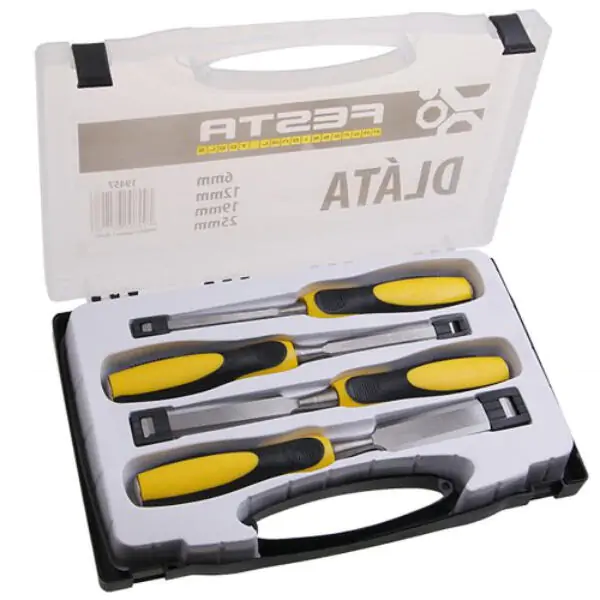• Set dleta Festa 4 kom 6, 12, 19, 25 mm sa ergonomskom plastičnom drškom, upadljiva površina. Oštrica je iskovana od CrV čelika kaljenog celom dužinom