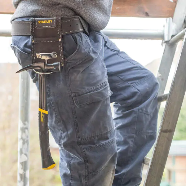 • Dvostruki šavovi sa zakovicama su dodatno pojačani na kožnom pojasu za čekić Stanley, što dodatno povećava njegovu izdržljivost i pouzdanost tokom rada. Metalna kuka za čekić omogućava praktično odlaganje alata, pružajući vam slobodu kretanja i lakoću pristupa čekiću.