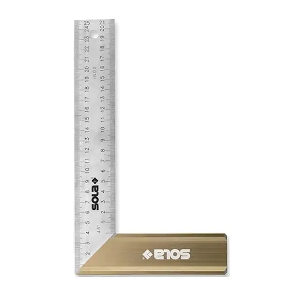 Profesionalni stolarski ugaonik SOLA SRB izrađen je od nerđajućeg čelika sa aluminijumskom ručkom za udoban rad. Opremljen je mrežnom skalom u mm i cm, kao i dvodelnim stepenovanjem uglova od 45°, 90° i 135°, što omogućava precizno označavanje i rad u stolarskim i DIY projektima. Kombinacija čelika i aluminijuma pruža izdržljivost, preciznost i dug vek trajanja alata.