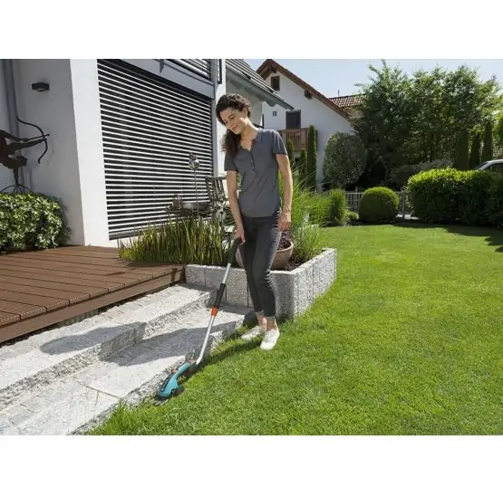 • Komplet GARDENA sa teleskopskom ručkom i točkićima olakšava precizno sečenje duž ivica travnjaka ili pokrivača tla dok je u uspravnom položaju bez savijanja.