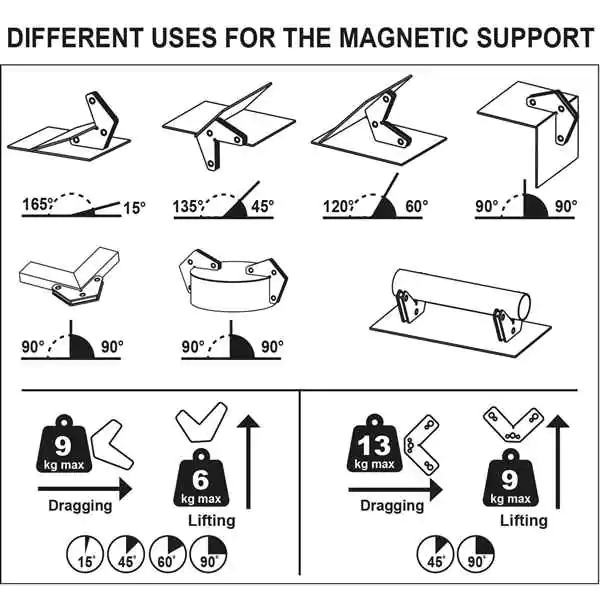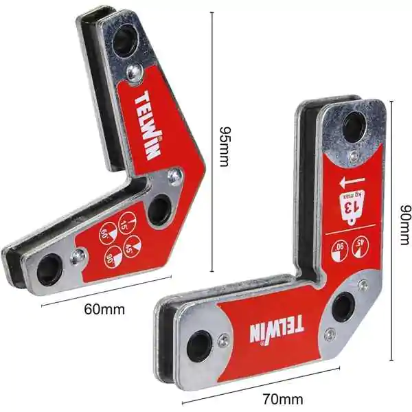 • TELWIN magnetni držači za zavarivanje, poznati kao magnetni pozicioneri za zavarivanje, izuzetno su korisni alati koji omogućavaju stabilno i precizno pozicioniranje delova tokom rada. Ovi magnetni držači obezbeđuju čvrsto fiksiranje elemenata kako bi se postigla maksimalna preciznost i visok kvalitet zavarenih spojeva. Uz pomoć ovih pozicionera, elementi se mogu spajati pod različitim uglovima, uključujući 15°, 45°, 60° i 90°, što omogućava široku primenu u različitim vrstama konstrukcija.