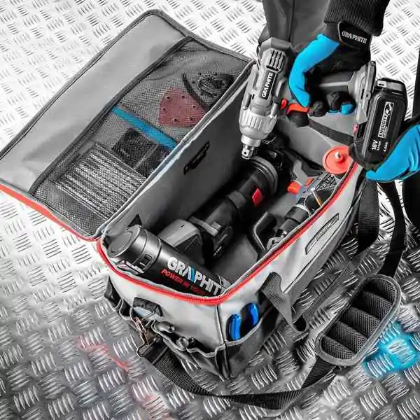 • GRAPHITE torba za alat ENERGY+ opremljena je čvrstom ručkom i podesivom naramenicom za udoban transport. Prenosiva torba za alat pogodna je za rad na terenu, radionice ili gradilišta.