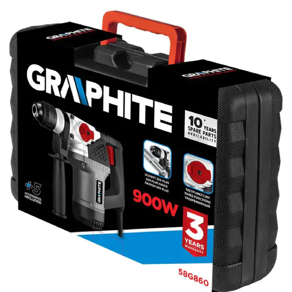 • GRAPHITE SDS+ čekić bušilica model 58G860 je profesionalni elektro-pneumatski alat snage 900 W, dizajniran za zahtevne građevinske, montažne i demontažne radove. Sa tri režima rada – bušenje, bušenje sa udarom i štemovanje – alat nudi izuzetnu svestranost, omogućavajući precizno bušenje u betonu (do 28 mm), drvetu (40 mm) i metalu (13 mm), kao i efikasno uklanjanje maltera i keramike. Maksimalna udarna energija od 4 J i frekvencija udara od 3850 min⁻¹ obezbeđuju brz i produktivan rad na čvrstim površinama, dok ergonomska ručka sa dvotačkastim antivibracionim sistemom i protivkliznom oblogom smanjuje zamor i povećava kontrolu tokom dugotrajne upotrebe. Ojačano kućište od magnezijumske legure garantuje dug vek trajanja, a fleksibilni kabl dužine 4 m omogućava slobodu kretanja na radilištu. U kompletu se isporučuje sa SDS+ burgijom, dletom, ključem, dodatnom ručkom, graničnikom dubine, posudom sa mašću i robustnim transportnim koferom, čime se obezbeđuje praktično skladištenje i zaštita alata. Sa CE sertifikatom i nivoom zvučne snage od 107,1 dB, ovaj čekić bušilica predstavlja pouzdano i efikasno rešenje za profesionalce koji traže visoke performanse i izdržljivost.